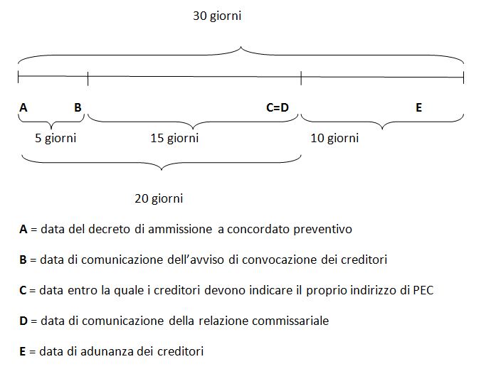 Certamente lo schema rappresentato mostra una situazione limite, volendo comunque evidenziare che quanto prima il commissario giudiziale provvederà a inviare la comunicazione dell'avviso di convocazione, tanto poi sarà agevolato nelle comunicazioni successive, in primis, quella relativa alla propria relazione. Medesima comunicazione ai creditori «a norma dell'art. 171, secondo comma» è dovuta dal commissario giudiziale con riguardo all'apertura del procedimento per la revoca dell'ammissione al concordato, in virtù dell'aggiunta posta al primo comma dell'art. 173 l.f. In tal caso, è evidente, non può trovare applicazione alcuna strategia di tempistica comunicativa. Con il D.L. 179/2012 si è voluto poi estendere (profili scelti del)la disciplina dei rapporti riepilogativi cui è tenuto il curatore nel fallimento ai sensi dell'art. 33 l.f., anche nel c.d. «concordato con cessione dei beni» previsto dall'art. 182 l.f. In base alla normativa innovata, dunque, il liquidatore, «con periodicità semestrale dalla nomina», provvederà a redigere un rapporto riepilogativo delle attività svolte, accompagnato dal conto della gestione, che sarà oggetto di cognizione da parte del comitato dei creditori, affinché lo stesso o ciascuno dei suoi componenti possano formulare osservazioni scritte. Una copia del rapporto sarà inoltre trasmessa dal liquidatore al commissario giudiziale «a mezzo di posta elettronica certificata», affinché lo stesso commissario lo possa trasmettere ai creditori, ancora, «a norma dell'art. 171, secondo comma».