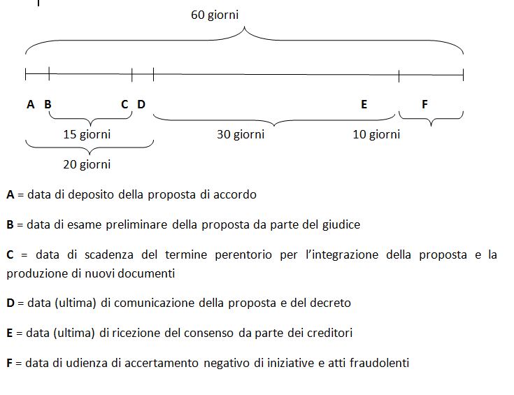 L'accordo di composizione della crisi. Al deposito della proposta di accordo segue immediatamenteun esame preliminare della stessa da parte del giudice, da tenersi anche fuori udienza e senza necessità di audizione né del proponente, né dell'organismo di composizione ausiliario. Così infatti è quanto desumibile dai primi due commi dell'art. 10, rimanendo il testo di legge piuttosto vago sul punto. In sede di esame preliminare, il giudice: a) verifica che la proposta soddisfi i requisiti soggettivi di ammissibilità e oggettivi di contenuto, nonché sia corredata di tutta la documentazione ex lege richiesta, in ossequio, rispettivamente, alle previsioni di cui agli articoli 7, 8 e 9; b) può concedere, se il proponente ne ha fatto istanza, il termine perentorio di quindici giorni ex art. 9, comma 3-ter, ad integrazione della proposta incompleta nel contenuto o negli allegati; c) con decreto: fissa unaprima udienza di accertamento negativo di iniziative o atti fraudolenti (come in effetti risulta dall'art. 10, comma 3); stabilisce idonea forma di pubblicità della proposta e del decreto, ulteriore alla pubblicazione degli stessi nel registro delle imprese, richiesta nel caso in cui il proponente svolga attività d'impresa; ordina, ove il piano preveda la cessione o l'affidamento a terzi di beni immobili o di beni mobili registrati, la trascrizione del decreto, a cura dell'organismo di composizione della crisi, presso gli uffici competenti; dispone che (dalla data - della pubblicità - del decreto, e non già da quella della deposito, e) sino al momento in cui il provvedimento di omologazione diventa definitivo, non possono, sotto pena di nullità, essere: iniziate o proseguite azioni esecutive individuali; disposti sequestri conservativi (con apparente salvezza, dunque, delle altre misure cautelari); acquistati diritti di prelazione sul patrimonio del debitore che ha presentato la proposta di accordo, da parte dei creditori aventi titolo o causa anteriore. Si noti peraltro che, in tutte e tre le sue declinazioni, il divieto, qui, non opera - come in altri contesti concorsuali - ex lege, bensì per ordine del giudice, seppur dovuto e non discrezionale. Ad ogni modo, si precisa, la sospensione non tocca i titolari di crediti impignorabili, ai quali, infatti, deve essere assicurato il regolare (i.e. integrale) pagamento ex art. 7, comma 1; d) dispone la comunicazione della proposta e del decreto, a cura (si ritiene) dell'organismo di composizione della crisi, ai creditori (e ai titolari di altri diritti, tutti risultanti dagli elenchi depositati), nonché (si aggiunge) al proponente stesso (che non può non essere notiziato del decreto di fissazione dell'udienza), presso la rispettiva residenza o sede legale, a mezzo, in primis (si dovrebbe affermare), posta elettronica certificata, se l'indirizzo del destinatario risulta dal registro delle imprese ovvero dall'Indice nazionale degli indirizzi di posta elettronica certificata delle imprese e dei professionisti (INI-PEC) e, in ogni altro caso, a mezzo telefax o lettera raccomandata. È in particolare previsto che tra il giorno del deposito della proposta e quello dell'udienza non debbano decorrere più di sessanta giorni e che la comunicazione della proposta e del decreto debba effettuarsi almeno trenta giorni prima del termine entro il quale i creditori, a norma dell'art. 11, comma 1, debbono far pervenire il proprio consenso all'accordo, fissato a sua volta ad almeno dieci giorni prima dell'udienza stessa. Si ritiene di comprendere il testo di legge secondo lo schema seguente.