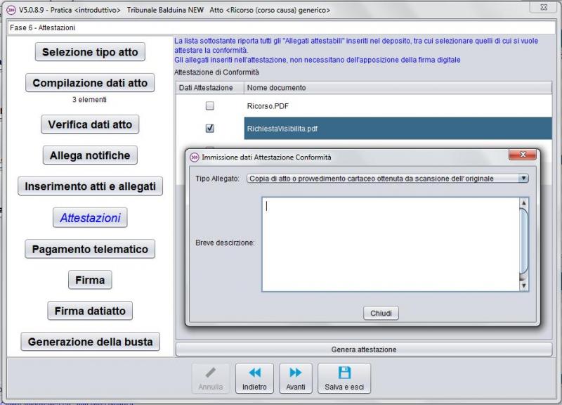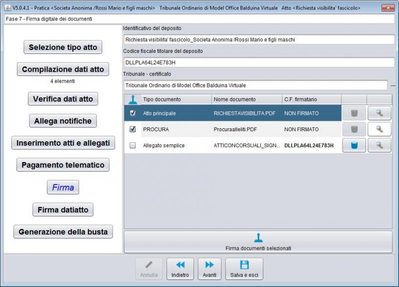 Di norma al termine del processo di firma dei vari documenti, resta ancora possibile intervenire per eliminarne la firma e/o visualizzare ogni singolo documento, rispettivamente utilizzando le funzioni messe a disposizione dal proprio redattore. Alcuni redattori propongono in una fase separata, la firma del file contenente le informazioni raccolte, denominato datiatto.xml, mostrando anche il riepilogo dei dati del deposito. Creazione busta e spedizione atto via PEC