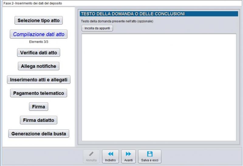 Un dato opzionale che in alcuni redattori è possibile inserire è il “Testo della domanda o delle conclusioni”. I dati inseriti in questo campo, devono corrispondere alle conclusioni già precisate nell'atto principale (memorie conclusive), non sono visualizzabili dalla consolle della cancelleria ma solo dal software del magistrato permettendo a questi un eventuale “copia-incolla” delle richieste di parte.