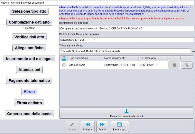 Terminata la raccolta dei documenti, si procede con l'apposizione della firma digitale, in questo caso obbligatoriamente, sull'Atto Principale, sulla Procura alle liti, sul datiatto.xml.