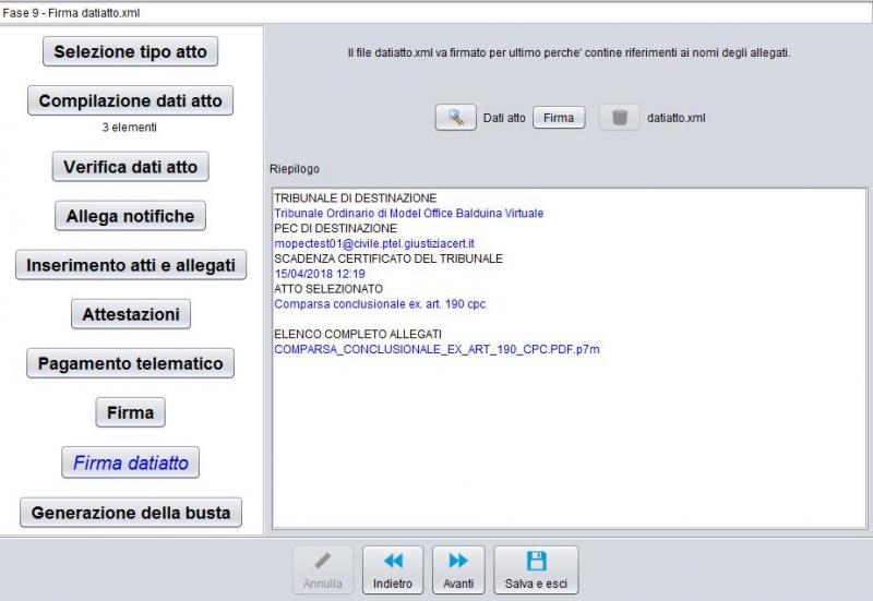 Alcuni redattori propongono in una fase separata, la firma del file contenente le informazioni raccolte, denominato datiatto.xml, mostrando anche il riepilogo dei dati del deposito.