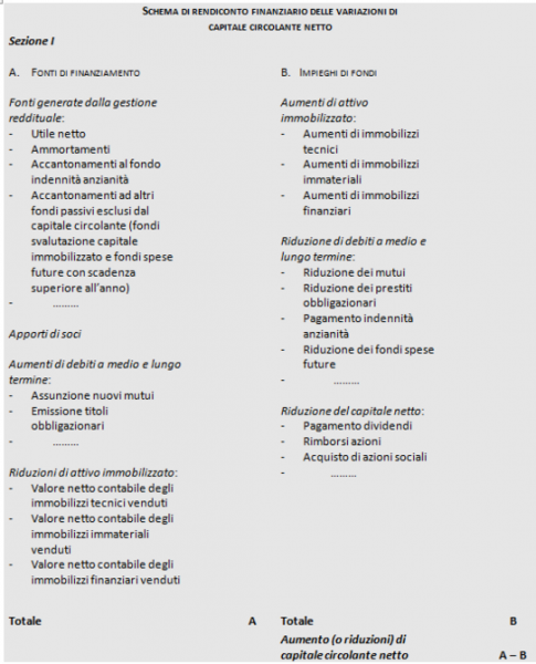In particolare, la prima parte del prospetto, che rappresenta la parte fondamentale, è quella nella quale vengono rappresentate le variazioni che caratterizzano il CCN sia dal lato delle fonti che dal lato degli impieghi; vengono indicate, cioè, le provenienze delle risorse finanziarie e, contemporaneamente, i modi di investimento delle stesse.