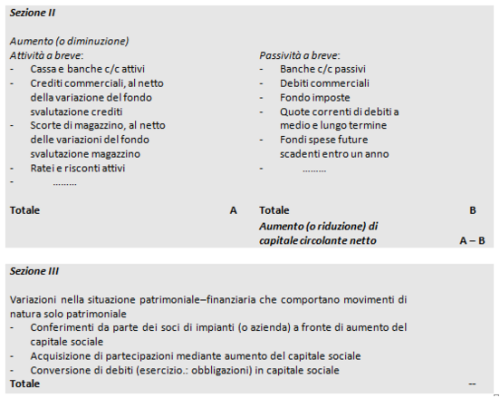 Il rendiconto finanziario delle variazioni del capitale circolante netto si articola in tre parti, che mostrano: