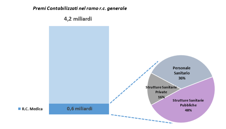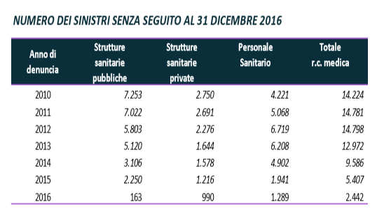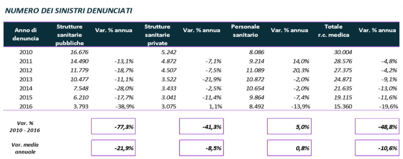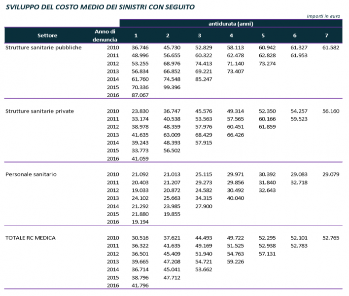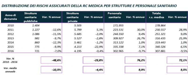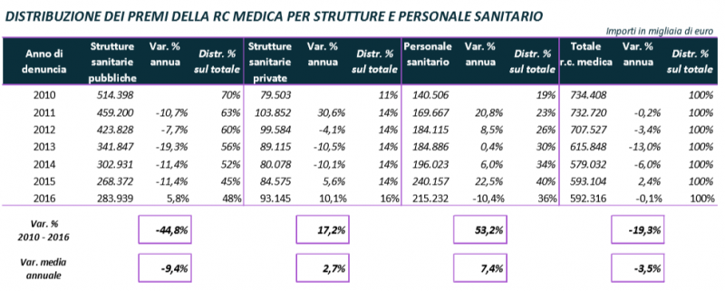 Lo studio tiene conto di rischi assicurati, premi e sinistri dal 2010 al 2016 e rivela un ammontare complessivo di premi contabilizzati, pari a 592,3 milioni nell'anno 2016, che incidono per quasi il 15% sul volume premi del ramo assicurativo ministeriale della Responsabilità Civile Generale (che nello stesso anno ha registrato una raccolta complessiva, tra imprese italiane ed estere, pari a circa 4,2 miliardi di euro). Tra il 2010 ed il 2016 il volume dei premi totale è diminuito di quasi il 20% (da 734 a 592 milioni), quasi certamente per il forte calo dei premi relativi alle strutture sanitarie pubbliche che hanno scelto la via dell'autoassicurazione. Sono risultati invece in aumento i premi del personale sanitario (+53%) e quelli delle strutture sanitarie private (+17,2%).