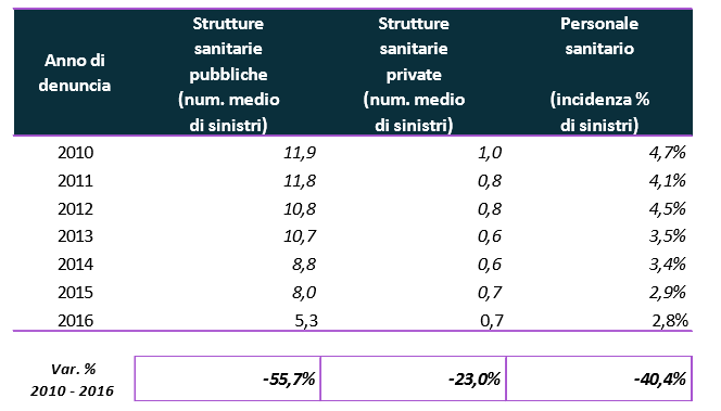 Sull'intero periodo osservato, tuttavia, il numero totale dei sinistri denunciati si è sostanzialmente dimezzato, passando dai circa 30 mila sinistri denunciati nel 2010, a 15.360 sinistri denunciati nel 2016. Nello stesso periodo sono diminuiti anche i sinistri denunciati dalle strutture sanitarie private (-41%) mentre quelli denunciati sulle polizze del personale sanitario sono cresciuti tra il 2010 ed il 2012, per poi vedere un progressivo calo, cosicché la loro crescita complessiva è stata abbastanza lieve (+5,0%). A questo positivo andamento ha contribuito certamente il fenomeno dell'allontanamento dalle forme di assicurazione tradizionale da parte delle strutture sanitarie pubbliche, del quale si è già fatto cenno. Ciò che è importante osservare, tuttavia, è che, se rapportiamo il numero dei sinistri denunciati al numero dei rischi assicurati, è possibile ottenere un indicatore sintetico di sinistrosità (normalmente definito frequenza sinistri) assai più positivo. Dal 2010 al 2016, infatti, l'indice di sinistrosità: