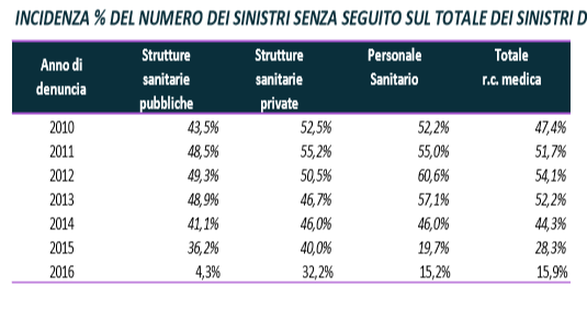 A questo generale abbattimento della sinistrosità ha contribuito, oltre che l'applicazione di meccanismi di partecipazione al rischio da parte dell'Assicurato, come SIR e franchigie, anche la forte spinta verso il miglioramento del livello di gestione del rischio che ha caratterizzato la politica di molte strutture ospedaliere, sia pubbliche che private. E se è pur vero che tale progresso è stato in parte determinato proprio dalla presenza di cospicue franchigie e SIR, è comunque rilevante lo sforzo prodotto in questo senso dall'intero Servizio Sanitario Nazionale: a testimoniare la sua importanza, anche la l. n. 24/2017 (Legge Gelli), dedica interamente i primi 4 articoli al miglioramento della gestione del rischio clinico. Ma le coperture assicurative della Responsabilità Medica sono anche caratterizzate da un'elevata incidenza di sinistri che, una volta denunciati, non danno luogo ad alcun risarcimento. Ciò può accadere perché, una volta esperito tutto il processo per accertare la responsabilità del sanitario (sia esso il professionista o la struttura), può risultare che in realtà non si è verificato alcun atto di negligenza che abbia causato il danno. La tavola successiva riporta quindi il numero dei sinistri che le compagnie hanno chiuso senza effettuare alcun pagamento (i cosiddetti sinistri senza seguito), per ciascun anno di denuncia, nel periodo osservato.