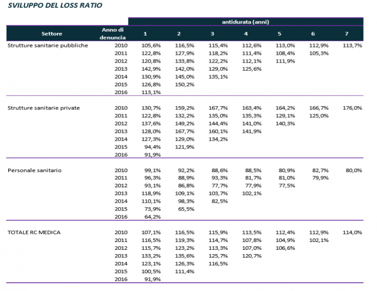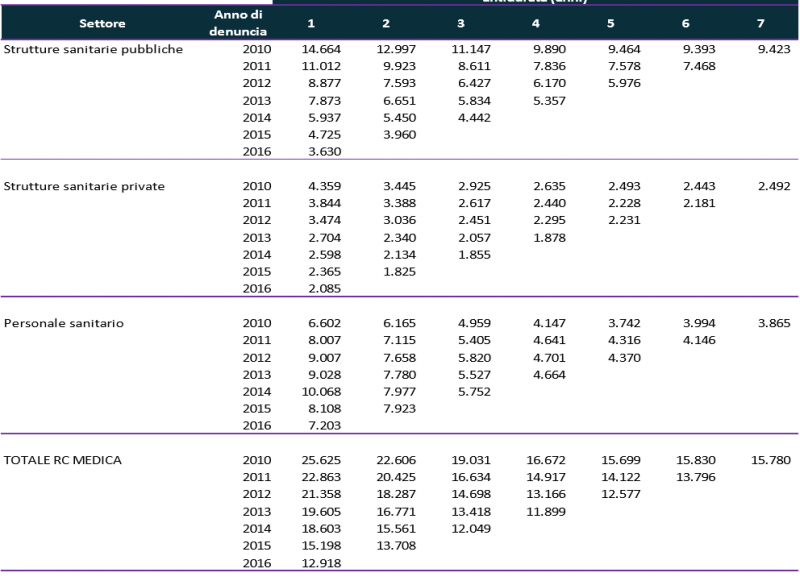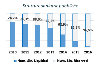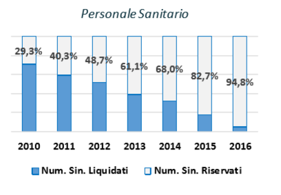 Un altro fattore che causa grandi difficoltà agli assicuratori è la lunga durata di questo tipo di sinistri. Le tavole seguenti riportano la percentuale dei sinistri liquidati e riservati, sul totale dei sinistri protocollati, per le Strutture Pubbliche e per il Personale Sanitario. Le percentuali relative ai sinistri liquidati sono assai più basse per le generazioni più recenti, in quanto sono ancora incerte sia l'effettiva responsabilità dell'assicurato che l'entità del danno, ma crescono col crescere dell'anzianità dei sinistri stessi. È possibile notare come a sette anni dalla denuncia debba essere ancora definita una percentuale rilevante di sinistri. In particolare, fra i settori analizzati è quello del personale sanitario ad avere l'incidenza più alta di sinistri da liquidare. Per la generazione di denuncia più matura (2010), infatti, dopo 7 anni di sviluppo risulta ancora da pagare il 29,3% dei sinistri rubricati.