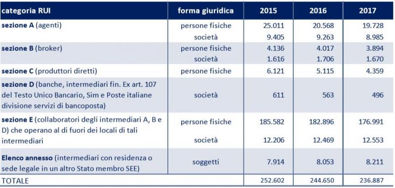 Per quanto attiene alla funzione prevista alla Sezione A, in passato esisteva la figura di agente monomandatario, che svolgeva la sua attività per una sola impresa di assicurazione. In base alla l. n. 40 del 2 aprile 2007, però, tale posizione è oggi consentita solo per l'intermediazione dei contratti “Vita”, mentre per i contratti “Non Vita” (o “Danni”) non esistono più accordi in esclusiva tra l'intermediario ed una sola compagnia assicuratrice. Secondo il più recente rapporto ANIA (L'assicurazione italiana in cifre, ed. 2018), al 31 dicembre 2017 risultavano iscritti al RUI 236.887 soggetti (tra persone fisiche e società), così suddivisi per le rispettive sezioni: