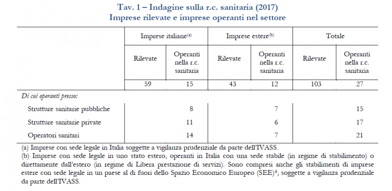 Le polizze assicurative da R.C. sanitaria fanno parte del più ampio ramo della R.C. generale, del quale nel 2017 rappresentavano circa un settimo dei premi complessivi. I dati su questo tipo di polizze vengono annualmente acquisiti da parte dell'organo di sorveglianza del settore assicurativo e provengono direttamente dalle imprese di assicurazione. L'ultima rilevazione ha riguardato in particolare: a) i premi raccolti nel 2017 per rischi localizzati in Italia, b) le prospettive e gli ostacoli nel settore dal punto di vista delle imprese, c) le principali caratteristiche delle coperture assicurative collocate nel 2017, d) la situazione dei sinistri denunciati negli anni compresi tra il 2010 ed il 2017.