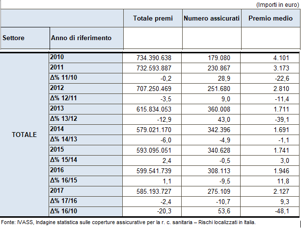 rispetto al 2016 (-2,4%). In particolare, prosegue la riduzione dei premi relativi alle coperture delle strutture pubbliche, che ora ammontano a 272 milioni di euro (–6,2% rispetto al 2016 e ben il 47,1% in meno rispetto al 2010). Ciò dipende dalla flessione del numero di strutture pubbliche assicurate (685, contro le 1.404 del 2010), mentre aumentano costantemente quelle che hanno optato per l'accantonamento di risorse per gestire internamente il rischio. Il contenzioso giudiziario impatta sul 13,8% dei sinistri risarciti tra il 2010 e il 2017 e sul 27,1% di quelli messi a riserva alla fine dello stesso periodo. I premi pagati dai professionisti sanitari sono gradualmente aumentati, cosicché il premio medio per la categoria dei medici ammonta ora a circa 1.040 euro, contro 173 euro pagati mediamente dagli altri professionisti sanitari. Permane un'elevata concentrazione dei rischi attinenti le strutture pubbliche, assicurate per il 96,4% dai maggiori 5 operatori. La concentrazione dei premi del personale sanitario, il 71,4% dei quali è coperto dai maggiori 5 operatori è inferiore, ma in lieve aumento rispetto al 2016. In genere, in questo settore è particolarmente rilevante il ruolo delle imprese estere, che nel 2017 hanno raccolto il 94% dei premi delle strutture pubbliche, il 37,7% di quelle private ed il 24,2% delle coperture dei professionisti sanitari. Le imprese italiane, infatti, operano principalmente nell'offerta di coperture al personale sanitario e alle strutture private: la loro presenza nell'ambito pubblico resta quindi marginale. Anche nel settore che riguarda i professionisti sanitari, dove la maggioranza della raccolta premi è stata effettuata da imprese italiane, è tuttavia accresciuta la presenza degli assicuratori esteri, con una quota premi che è passata dal 15,4% al 24,2%.