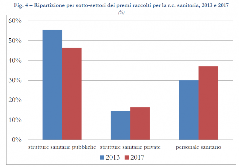 Come si è accennato, i premi relativi alle strutture pubbliche sono ancora in calo, per il fenomeno dell'autoassicurazione, mentre sono aumentati quelli raccolti dalle strutture private e dal personale sanitario, grazie alla spinta impressa dall'obbligo disposto dalla Legge Gelli.