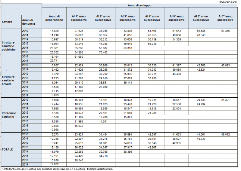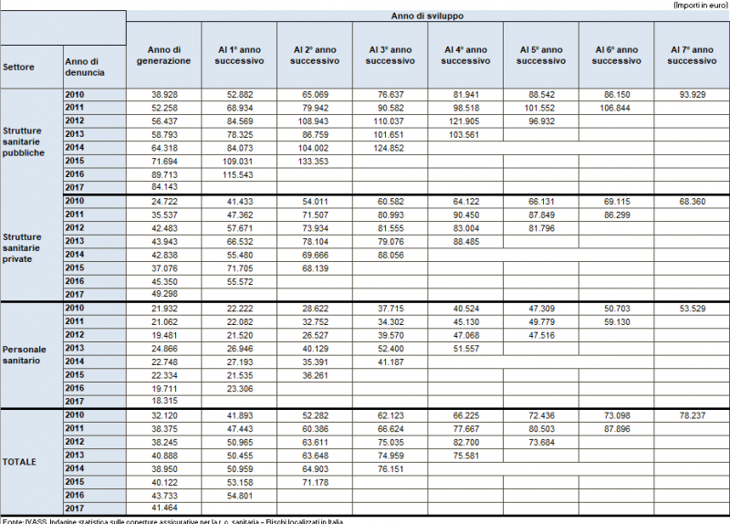 Nel 2017 sono pervenute agli assicuratori 18.418 denunce di sinistro. Il dato è in calo di oltre il 35% rispetto al 2010 ed è principalmente dovuto alla diminuzione del numero di strutture assicurate di cui si è parlato. Tra il 2010 e il 2017, sono invece in leggero aumento (+10%) le denunce a carico del personale sanitario. Un fenomeno preoccupante è costituito dall'elevato numero di denunce senza seguito, in media pari al 50,1% di quelle complessivamente ricevute dal 2010 al 2017. Per quanto sia nota la difficoltà a classificare una denuncia di sinistro come senza seguito nell'ambito della medical malpractice, infatti, c'è da rilevare come lo stesso dato relativo alla Responsabilità da circolazione di autoveicoli (RC Auto) non superi il 15%. Tenuto conto che la quasi totalità delle coperture funziona su base claims made, per cui le denunce pervenute in un anno si riferiscono ad unità di rischio assicurate nello stesso anno, possiamo calcolare che nel 2017 una struttura sanitaria pubblica ha ricevuto in media 8,44 denunce, di cui solo 5,81 hanno dato luogo ad un pagamento o sono state poste a riserva. Le imprese assicurative hanno risarcito 45.129 sinistri denunciati nel periodo in esame, per un importo complessivo pari a 1.851 milioni di euro. È inoltre evidente l'aumento dell'ammontare medio del risarcimento nel corso del tempo. La tavola che segue mostra, diviso per settore assicurato, lo sviluppo del risarcimento medio nel corso degli anni soggetti allo studio. In pratica, se guardiamo al dato relativo alle strutture pubbliche, l'ammontare medio di un sinistro denunciato nel 2010 ed ancora aperto nel 2017 è aumentato da 17.020 euro a ben 57.365 euro. Le ragioni sono sempre da attribuire alla difficoltà nel valutare la portata del danno sin dal momento della denuncia, ma anche all'estrema incertezza che ha caratterizzato l'evoluzione della nostra giurisprudenza in tema di danno alla persona.