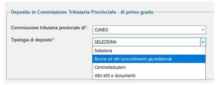 Effettuata la prima selezione, il sistema suggerirà il completamento del secondo menu a tendina, individuando tre aree di riferimento per il deposito: a) “ricorsi ed altri procedimenti giurisdizionali”; b) “controdeduzioni”; c) “altri atti e documenti”;