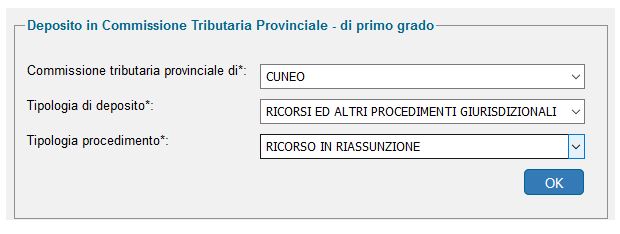 La scelta della tipologia di deposito, aggiungerà una nuova schermata, andando a costituire un campo prima non presente, la “tipologia del procedimento”. In esso figureranno, in un menù a tendina, le differenti tipologie di procedimenti ed atti possibili in relazione alla fase ricorsi precedentemente selezionata. Poiché intendiamo depositare ricorso in riassunzione, la scelta di tale voce completerà la fase preliminare ed aprirà la successiva schermata “compilazione della NIR Ricorsi” in seguito alla pressione sul pulsante OK. Per quanto concerne la presente scheda e le operazioni da compiere, si farà riferimento ad un ricorso in riassunzione in Commissione Provinciale.