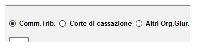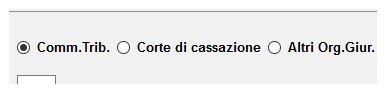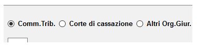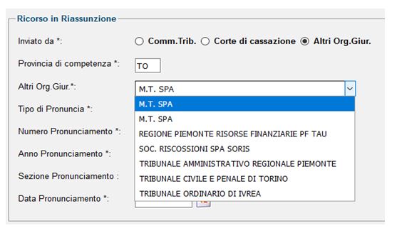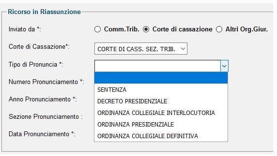 Nell'esempio di seguito riportato, si evidenzia come la selezione della voce “Corte di Cassazione” origini campi specifici e come la selezione, dal menu a tendina, della voce Corte di Cassazione Sezione Tributaria permetta il successivo inserimento del tipo di pronuncia attraverso altro menu a tendina.