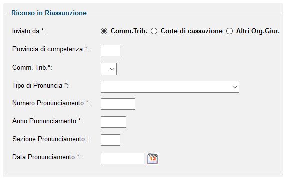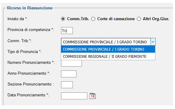La prima scelta “Commissione Tributaria” aprirà i seguenti campi a) Provincia di Competenza: la selezione della Provincia aprirà il successivo menu Comm.Trib; b) Commissione Tributaria: il menu a tendina recherà scelte specifiche in ragione della Provincia previamente inserita; c) Tipo di Pronuncia: con possibilità di selezione a menù tra Sentenza – Decreto Presidenziale – Ordinanza Collegiale Interlocutoria – Ordinanza Presidenziale - Ordinanza Collegiale Definitiva; d) Numero Pronunciamento: campo compilabile a tastiera o pad numerico; e) Anno Pronunciamento: campo compilabile a tastiera o pad numerico; f) Sezione Pronunciamento: campo facoltativo, compilabile come i precedenti; g) Data Pronunciamento: campo compilabile a tastiera, pad numerico o mediante clic sul calendario posto a fianco.