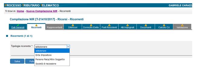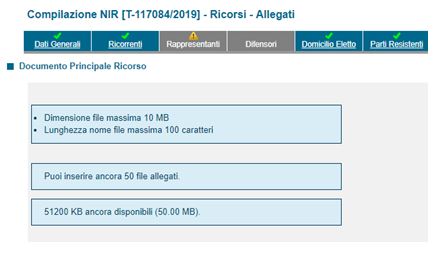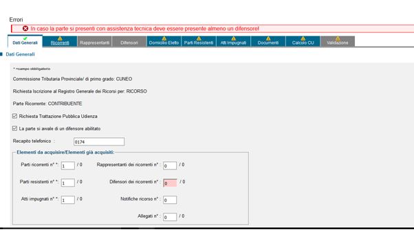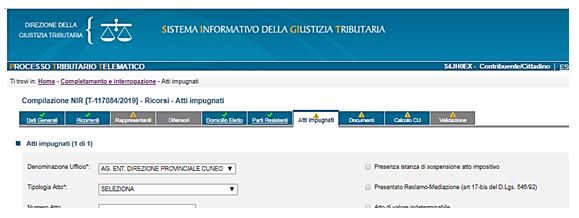 2. Ricorrenti: vengono riepilogati i dati del soggetto ricorrente, come sopra inseriti, nonché gli atti impugnati; 3. Rappresentanti: si rinvengono i dati dei rappresentanti del ricorrente ed il legame tra il soggetto rappresentante ed il rappresentato; 4. Difensori : vengono indicati i dati immessi circa la difesa tecnica, con annessa indicazione della parte assistita; 5. Domicilio eletto: viene ricordato in questa sezione se la parte ha eletto domicilio; 6. Parti resistenti: vengono indicate le parti resistenti e gli atti di riferimento; 7. Atti impugnati: nella sezione si reperiscono i dati immessi circa l'atto impugnato; si ritrova anche l'indicazione “Presenza istanza di sospensione atto impositivo” e “Presentato Reclamo-Mediazione”; entrambe le selezioni possono essere modificate in questa sede, senza dover ritornare alla schermata precedente; 8. Calcolo CU: si evidenzia quanto inserito con riguardo a valore della causa, CUT e modalità di versamento; 9. Documenti allegati: vengono riepilogati i documenti da trasmettersi unitamente alla NIR: ricorso ed allegati (copia atto impugnato; procura e ricevuta versamento CUT).