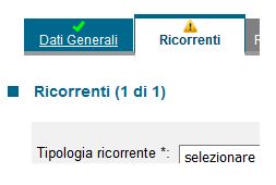 La seconda schermata proposta dal sistema riguarda i “Ricorrenti”; anche in questo caso, la nuova scheda viene proposta con l'attribuzione del simbolo del triangolo giallo, ad indicare che non è stata (ancora) compilata. In prima battuta, la schermata propone un menu a tendina circa la “Tipologia ricorrente” che può essere: