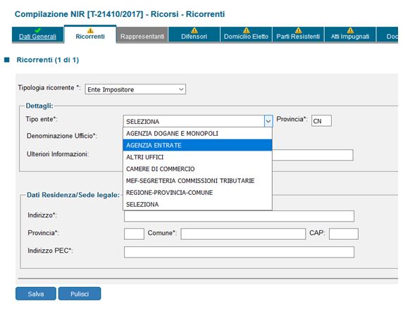 Tale prima scelta comporta l'apertura di tre possibili aree di compilazione, di cui due affini ed una diversa; tutte in comune hanno la parte finale “salva” e “pulisci”. Anche se la tipologia ordinaria sarà quella della “Persona Fisica”, per semplicità di descrizione, esaminiamo dapprima le altre due affini (Ente Impositore e Società di Riscossione) possibili per i casi diversi dal semplice ricorso, come, ad esempio, l'ottemperanza o la revocazione. Laddove come “Tipologia ricorrente” si selezioni “Ente Impositore” la schermata proporrà un primo riquadro “Dettagli” ed i campi a tendina “tipologia di Ente”, tra le quali voci occorrerà scegliere quella dell'Ente che sta effettuando il deposito, come nella schermata di seguito: