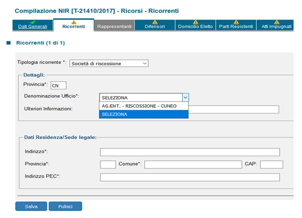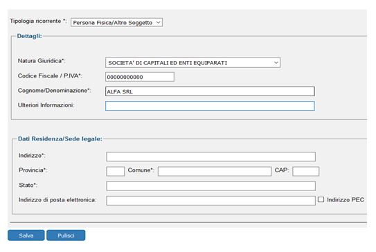 Come detto, i dati inseribili “codice fiscale e partita iva” “denominazione” “ulteriori informazioni” sono di testo e, per i primi due, viene effettuato un controllo formale, ossia non sono accettati codici fiscali e partite iva inferiori ad 11 caratteri Nell'esempio viene indicata una Società di Capitali, ma il procedimento è il medesimo per ogni ente non persona fisica. La parte in calce alla scheda “ricorrente” risulta comune a tutte le tipologie (Ente Impositore, Società di Riscossione, Persona Fisica) e presenta alcuni campi a testo libero “indirizzo”, “CAP” e “indirizzo di posta elettronica” (con possibilità di valorizzare se si tratti di casella PEC”, i campi “Provincia”, “Comune” e “Stato” vengono compilati mediante menu a tendina, come già esposto.