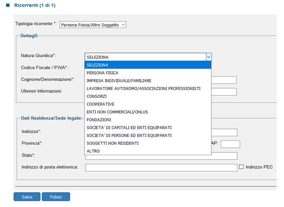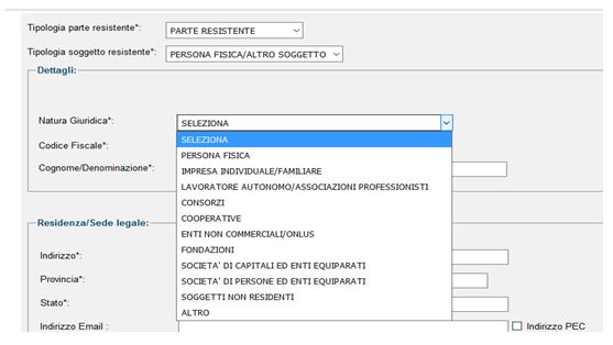 Quanto al soggetto “Persona fisica/Altro Soggetto”, la schermata risulta più articolata, ma sempre di tipo dinamico, ossia che verrà modificata in base alla natura giuridica selezionata tra quelle che vediamo nella schermata sottostante: