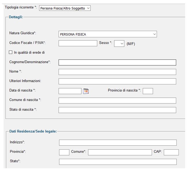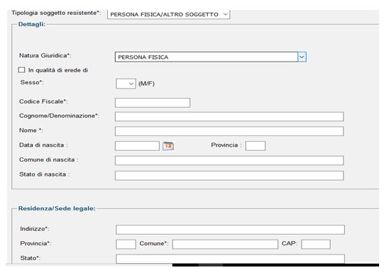 - “Codice Fiscale” e “Cognome/Denominazione”, sono campi comuni ed obbligatori per tutti i soggetti; altrimenti, in base alla tipologia dei soggetti verranno aggiunti anche altri campi, quali ad esempio i dati personali per la persona fisica e la possibilità di indicare che si agisce in qualità di eredi di altro soggetto.