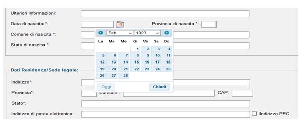Il campo “data di nascita” è da inserire mediante calendario (anche se si potrebbe farlo senza, è consigliabile utilizzare la funzione proposta); f) A seguire, i campi “provincia di nascita”, “comune di nascita” e “stato di nascita” vengono gestiti mediante menu a tendina, con possibilità di selezione in un elenco progressivamente ristretto in base alla voce precedente inserita (ossia i comuni proposti dipendono dalla provincia prescelta).