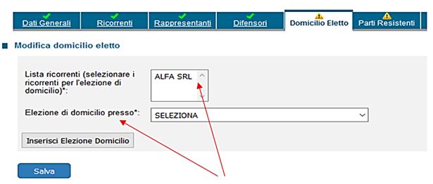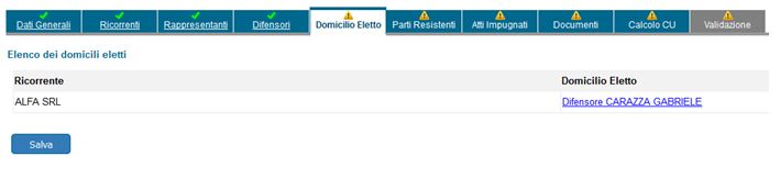 ATTENZIONE: Per acquisire il domicilio proposto, occorre confermare la schermata cliccando sul pulsante “Salva”. Se, invece, il domicilio eletto dal ricorrente fosse diverso, è possibile modificare tale dato ed indicare quello effettivo. Per la modifica clicchiamo sul link corrispondente al domicilio proposto e si aprirà la seguente maschera:
