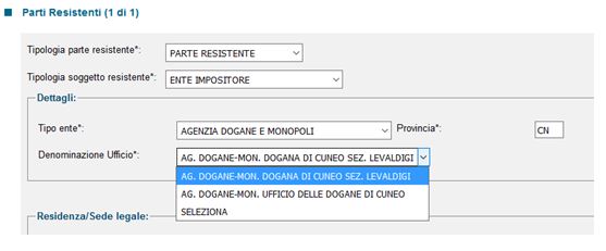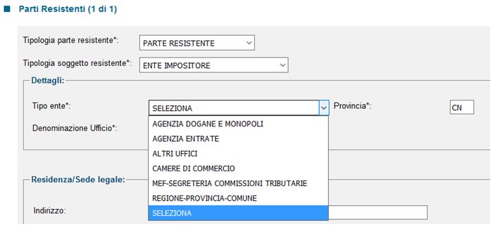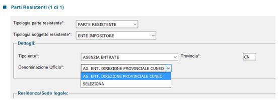 La sesta schermata proposta dal sistema riguarda le “Parti Resistenti”. La scheda propone un menu a tendina circa la “Tipologia parte ricorrente” che consente di scegliere tra le due voci possibili: – Parte Resistente – Altra Parte Resistente Salvo i casi particolari, che prevedono la presenza di una altra parte resistente oltre quella principale, selezioneremo la prima voce “PARTE RESISTENTE”; tale selezione apre un secondo menu “Tipologia soggetto resistente”, da cui si può selezionare – Ente Impositore – Persona Fisica/altro soggetto – Società Riscossione La nostra scelta andrà effettuata in base al soggetto contro cui stiamo presentando il ricorso, ed a cui lo abbiamo notificato, per cui se si tratta del “Concessionario per la riscossione” (oggi “Agenzia Entrate Riscossione”) che ci ha notificato una cartella esattoriale, o altro atto di sua competenza, sceglieremo la voce “Società di riscossione”, mentre se si tratta di qualunque altro soggetto che ci abbia notificato un atto di liquidazione o accertamento di imposte e tributi, selezioneremo la voce “Ente Impositore”. 10.1. Ente Impositore