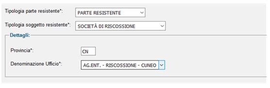 Se invece come “Tipologia ricorrente” si selezioni “Società di Riscossione” la schermata proporrà sempre un primo riquadro “Dettagli”, ma con i campi a tendina “Provincia (dell'agente di riscossione)” e poi il menù a tendina “denominazione ufficio” nel quale scegliere l'agente provinciale che sta effettuando il deposito, come nella schermata di seguito: Anche in questo caso è presente il campo a testo libero “ulteriori informazioni”.