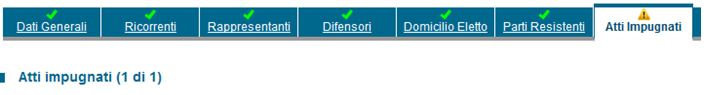 La settima schermata proposta dal sistema riguarda gli “Atti impugnati”; la scheda reca innanzitutto il numero di atti impugnati così come indicati in “dati generali”.