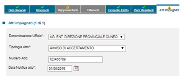 Nell'esempio, si ha “1 di 1”, poiché in dati generali si è indicato come 1 il numero di atti impugnati. Seguono quindi la scheda relativa alle “Imposte” e quella dove viene effettuata l'indicazione delle “Parti collegate all'atto”. 11.1. Atti