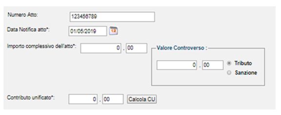 Il campo importo complessivo dell'atto consentirà di inserire il valore complessivo, andando a specificare se il “Valore Controverso” risulta essere il Tributo o la sola Sanzione. Abbiate cura di individuare esattamente se l'atto che state impugnando concerna il tributo e le sanzioni, oppure riguardi unicamente le sanzioni. Ricordate che l'unico importo rilevante ai fini della controversia è il valore controverso, in quanto su di esso viene calcolato il contributo unificato dovuto. Il pulsante “Contributo Unificato” è in effetti uno strumento di calcolo e cliccandoci sopra permette di conoscere agevolmente il CUT dovuto sulla base dell'importo indicato. Sul lato destro dello schermo invece sono presenti alcuni campi che è possibile selezionare:
