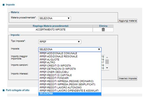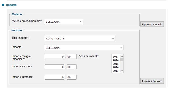 La seconda parte della schermata atti impugnati comporta la possibilità di inserire le imposte, indicando dapprima la “Materia Procedimentale” e solo dopo l'”Imposta”.