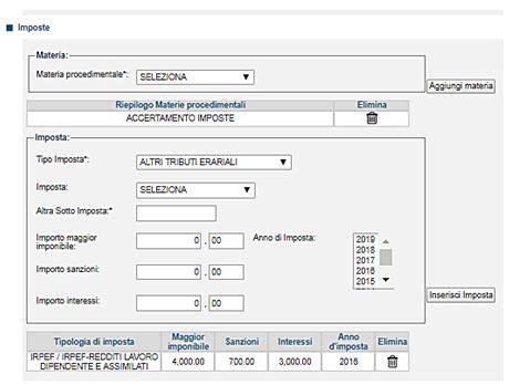 La Materia procedimentale viene selezionata attraverso il solito menu a tendina e confermato mediate il pulsante “Aggiungi Materia”. Le Imposte vengono selezionate dal menu “Tipo Imposta” con selezione successiva dell'“Imposta”. Il sistema ne faciliterà la individuazione in quanto a seconda del “Tipo” selezionato, ci proporrà solo le imposte ad esso corrispondenti. Nell'esempio, è stata selezionata la tipologia “IRPEF” e quindi il S.I.Gi.T. ci propone la scelta tra tutte le tipologie di tale voce d'imposta: