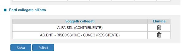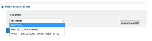La selezione andrà fatta uno per volta selezionando la singola voce e cliccando sul pulsante “aggiungi soggetto”; effettuata la selezione, tutti i soggetti risulteranno inseriti nel nuovo box “Soggetti collegati” e solo ora si potrà procedere oltre attraverso il pulsante “Salva” senza che il sistema ci segnali errori o campi assenti.
