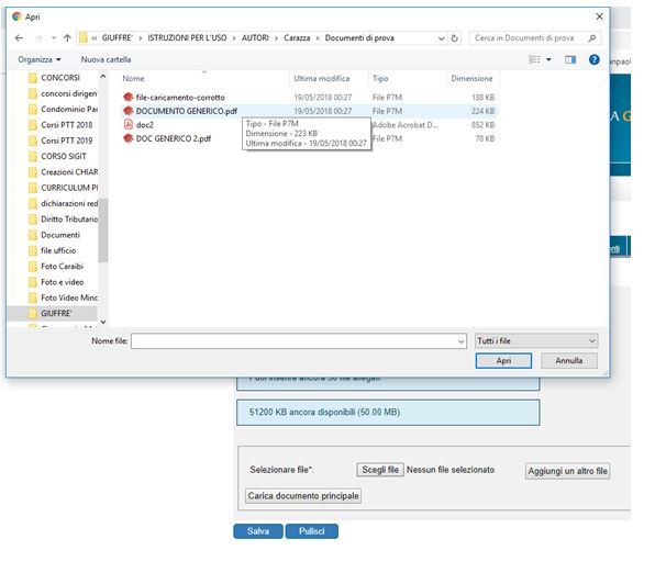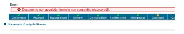 Scegliendo la cartella dove abbiamo salvato i file che intendiamo depositare ed individuato il file del ricorso, che avremo avuto cura di aver preliminarmente convertito nel formato .pdf/A e sottoscritto con una firma digitale CAdES (vedi l'articolo “Istruzioni per l'uso_ Articolo 2_Strumenti informatici e Documenti pre-processuali”) possiamo selezionarlo e cliccando sul pulsante “Apri” acquisirlo a bordo della NIR. Ci accorgeremo che il file è stato selezionato dal fatto che la voce a destra del pulsante “Scegli file” è cambiata da “Nessun file selezionato” al “Nome del file che abbiamo caricato” Cliccando sul pulsante “Carica documento principale” il sistema rileva il corretto formato del file (p7m) e, se così non fosse, segnala come errato l'inserimento del file del ricorso in pdf semplice: