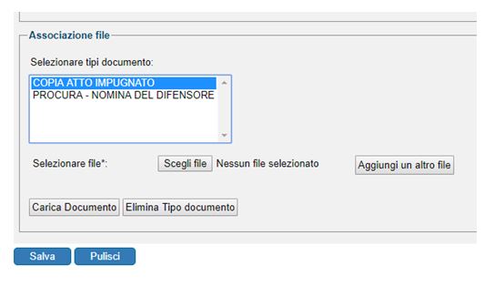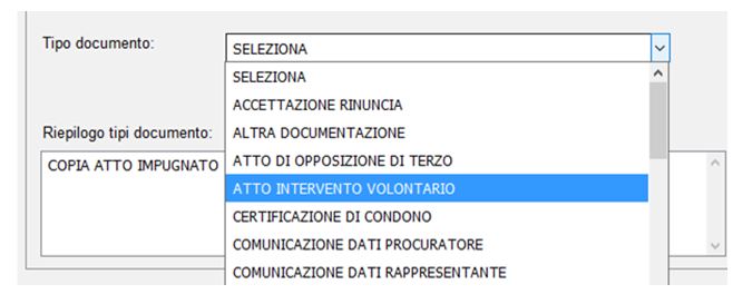 La selezione degli allegati risulta connessa al numero di allegati inseriti in prima pagina alla voce dati generali. Ricordate che prima di poter caricare a bordo i file dei nostri allegati è OBBLIGATORIO selezionare prima il “Tipo di documento” che ognuno di essi rappresenta rispetto al fascicolo processuale secondo la normativa del D.Lgs. 546/92. In altre parole dovremo prima selezionare quale atto tipico processuale intendiamo associare come definizione al file da caricare e ciò principalmente per consentire un'agevole lettura dei documenti presenti nel fascicolo processuale in base al tipo di atto che cerchiamo in esso ( se cerchiamo la copia dell'atto impugnato non dovremo aprire tutti i file per trovarlo, ma basterà aprire quello con la denominazione “Tipo di documento” “Copia atto impugnato”). La selezione “Tipo di documento” aprirà la schermata di upload relativa all'elenco di tutti quelli selezionabili secondo la denominazione del decreto menzionato. Nell'esempio viene visualizzata la schermata “Tipo di documento” ed una parte delle selezioni.