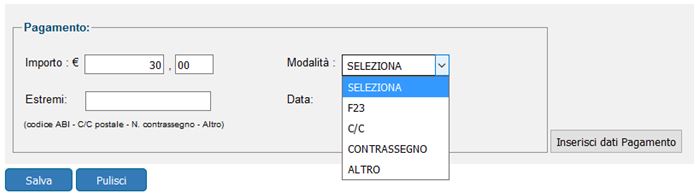 - Importo è un campo a testo libero dove inserire la cifra pagata - Modalità: con possibile selezione tra le voci F23/CC/Contrassegno/Altro - Estremi: campo a testo libero dove inserire il numero della ricevuta in nostro possesso - Data: campo a testo libero o calendario, come per tutti i campi calendario Terminato l'inserimento dei valori richiesti, si confermerà il pagamento mediante pulsante “Inserisci dati Pagamento”