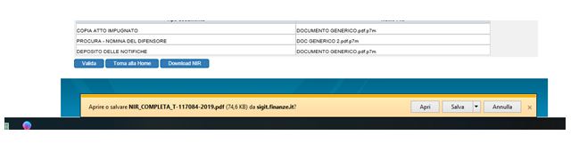 L'opzione Valida permette di verificare la regolarità della NIR e procedere al deposito, mentre l'opzione Download NIR consente di scaricare il PDF della NIR Completa, che verrà indicata come “bozza” nella filigrana personalizzata. Lo scaricamento della copia è particolarmente utile se i dati caricati sono numerosi e vogliamo essere certi di averli inseriti in modo corretto e completo, a prescindere dalla regolarità formale degli stessi, controllata, come vedremo, dal sistema in automatico. L'opzione Download NIR comporta la scelta tra i pulsanti “apri” o “salva” per passare oltre: