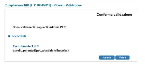 Quando siamo certi e vogliamo validare la nostra NIR, cliccando sul pulsante “Valida” si aprirà la schermata di riepilogo degli indirizzi PEC utilizzati e ciò in quanto se essi fossero errati sarebbe impossibile ricevere le comunicazioni del processo, le quali verrebbero recapitate a quelli errati indicati nella NIR stessa.