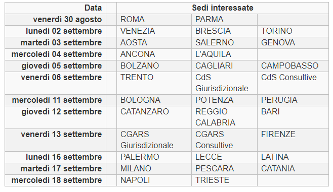 La Giustizia Amministrativa ha diffuso la tabella delle indisponibilità che interesseranno, tra venerdì 30 agosto e mercoledì 18 settembre 2019, il suo Sistema Informativo, al fine di completarne l'aggiornamento tecnologico. Ecco le date e le sedi interessate dal fermo del sistema:
